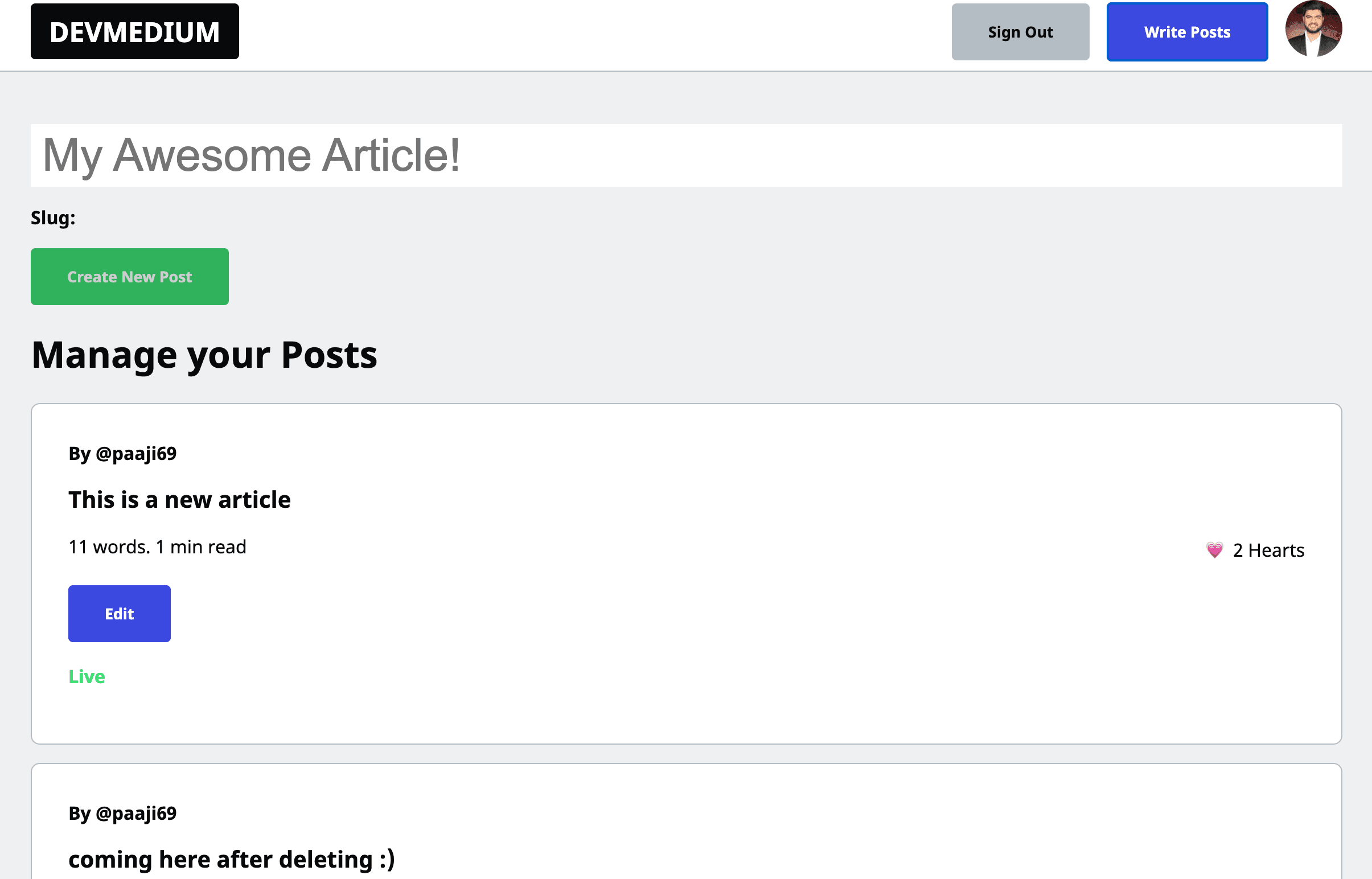 - User Profile page, Here the user can see all the posts from him along with the username. This route is public, Anyone can see any user with their posts./[username]/[slug].js