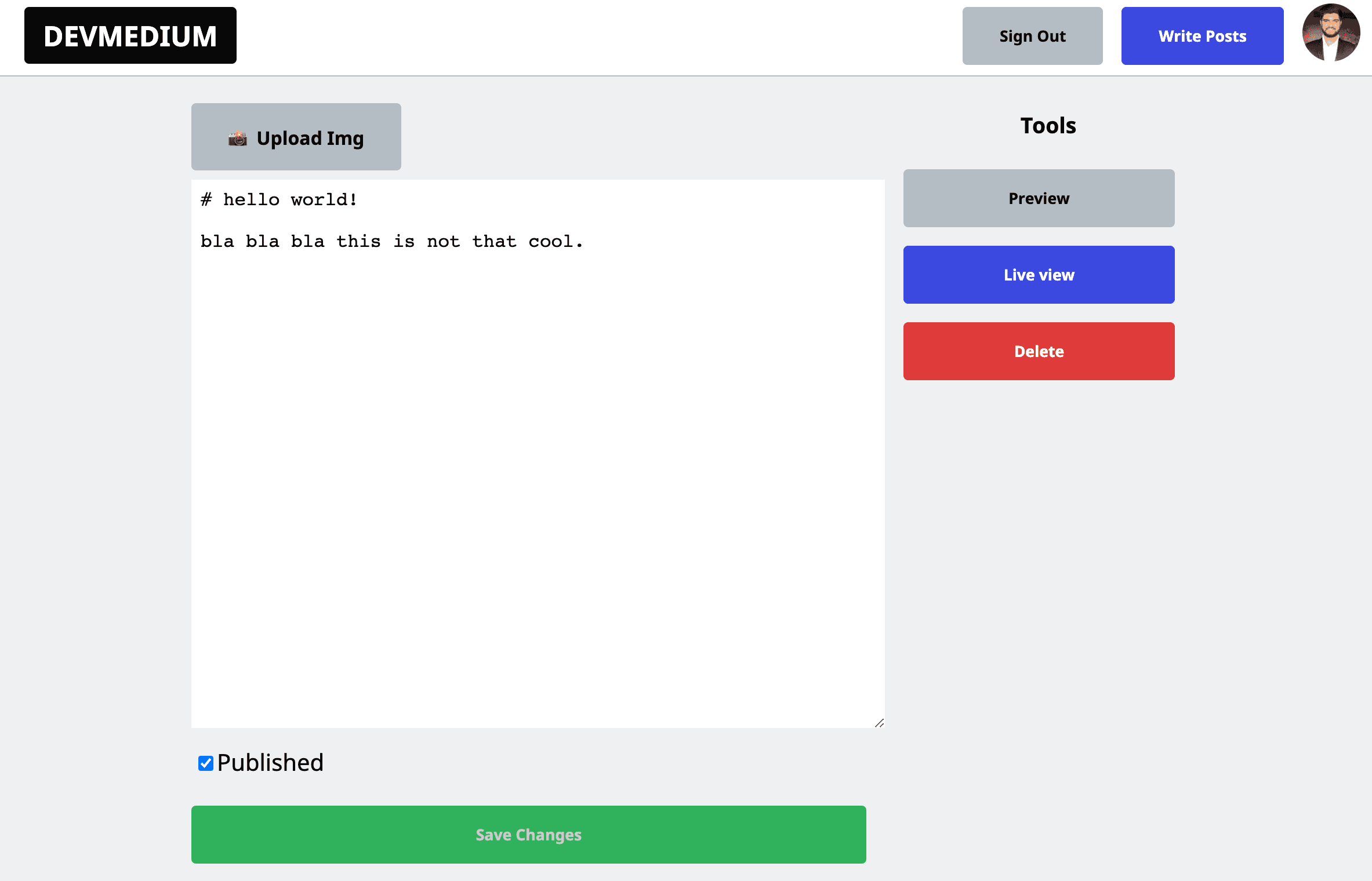 Here, A user, which is logged in, can see their created posts (published and unpublished) and create new posts. While the CRUD of managed posts are easy to understand, the creation of a post is interesting here.